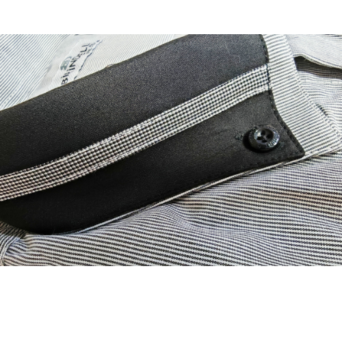 Kombinacija: bijelo-sivo , tanke prugice, crni detalj na kragni.